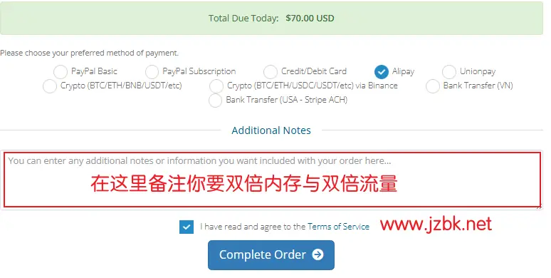 2.继续下一步,直到最后一步注册账户付款页面,再页面最下方可以看到下图备注框。这里填写需要内存流量翻倍,或者你购大硬盘也可以选择内存+sata磁盘翻倍,把你想要的配置使用百度翻译谷歌翻译都行,翻译成英文,粘贴到里面!然后填写相关信息后提交注册后面并且付款即可,等待工作人员添加,如果没有翻倍,请后台提交工单联系客服即可!