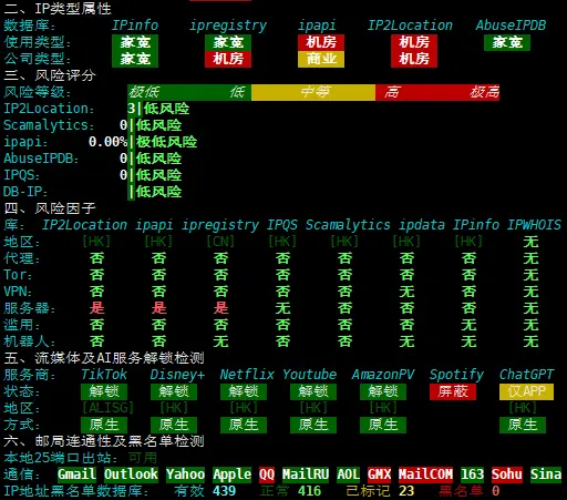 可以看到有点意外,有些检测网站竟然判定为加宽,无限价值纯属意外,风险因子ip十分干净,ip原生解锁几乎全部流媒体而且25端口开放状态!