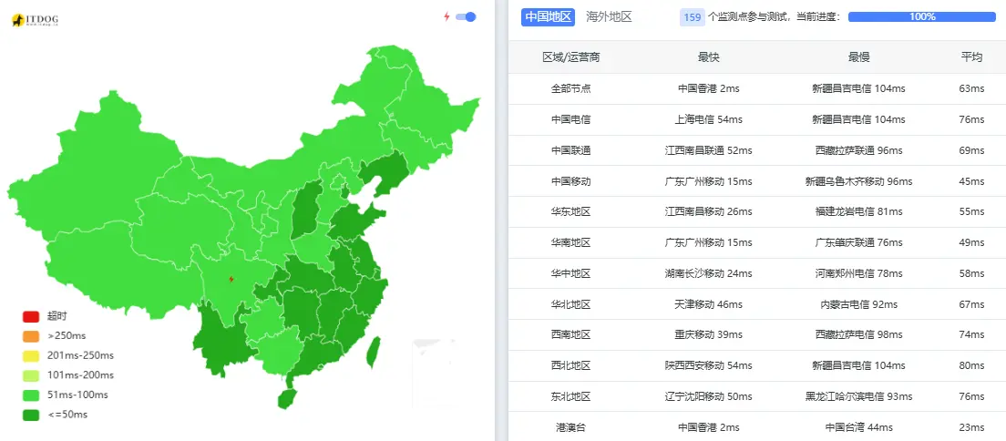 可以看到本次为中国优化线路,三网平均延迟都在50ms以下,绿油油一片!