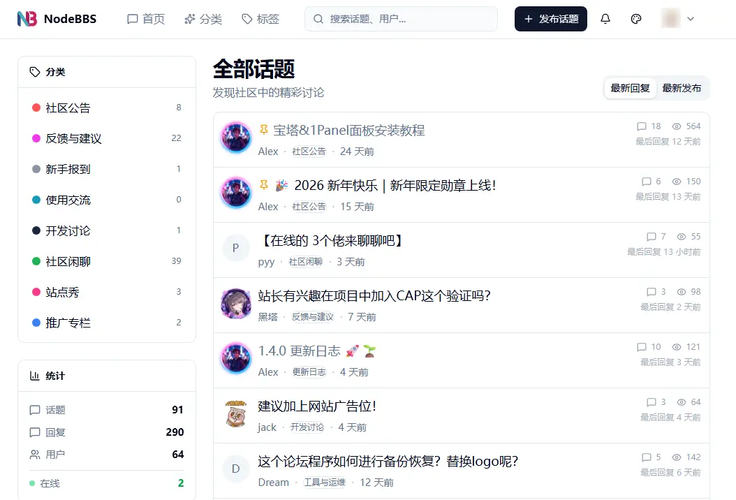 厌倦了臃肿复杂的论坛软件?试试NodeBBS——一个为技术社区量身打造的极简方案。老王在查看了几乎市面上全部论坛系统后,发行了这个宝藏系统,界面ui漂亮完美现代化,符合国人审美,轻巧,使用现代化技术栈开发总之太多优点了,目前刚出不久作者还在持续开发打磨,相信未来会更加完美,所以也分享给大家,如果你想建立一个论坛系统不妨试试!Discourse,太过重量级,而且ui有点不符合国人,flarum不太理想!还有n+系统都不符合心中的理想产品,唯有遇到nodebbs,大概介绍看下方吧!